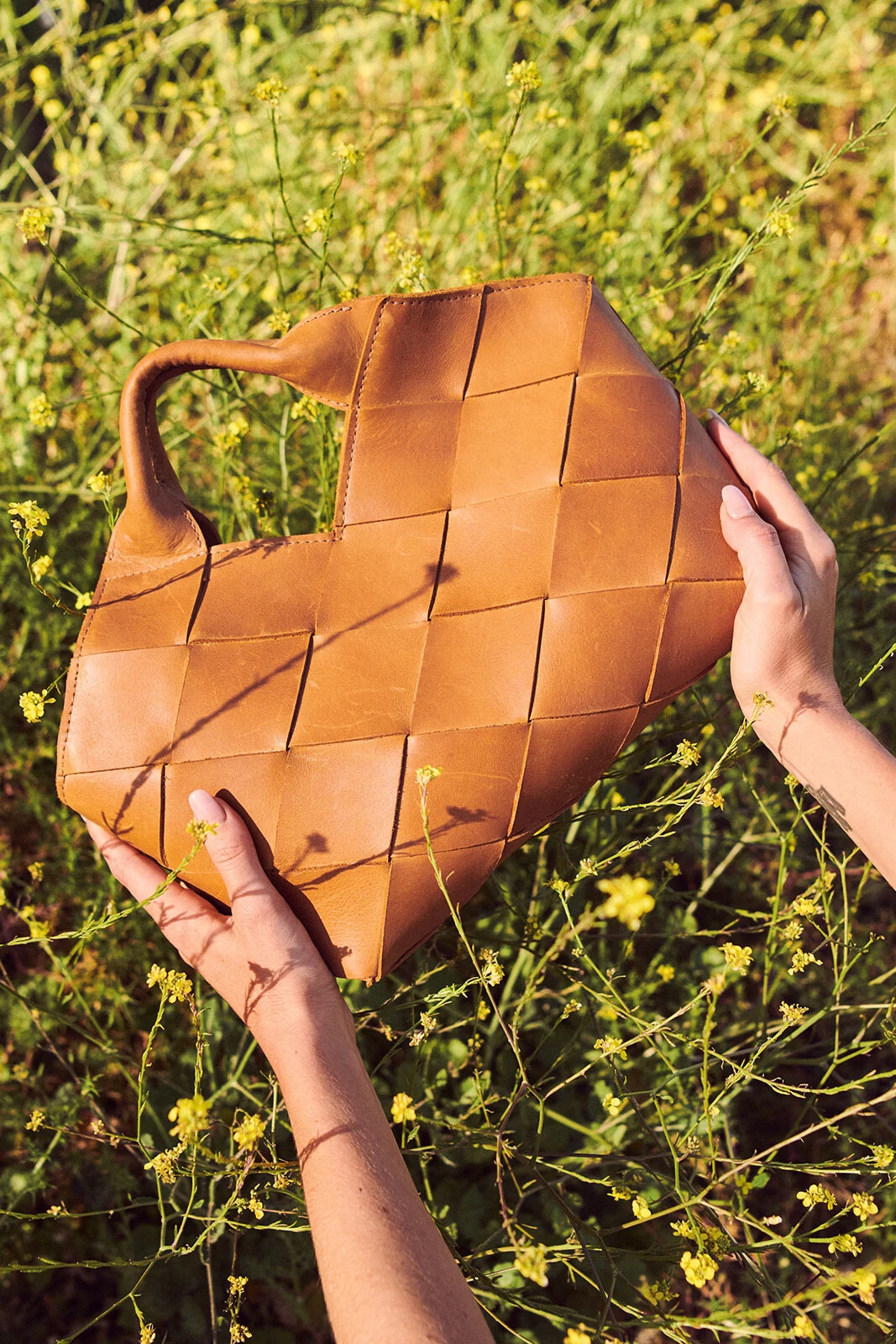 A stylish woven design elevates the Acacia Handbag by Parker Clay featuring a lined interior and adjustable, removable shoulder strap. Handcrafted from upcycled leather cuttings, this chic and sustainable bag is the perfect addition to your everyday accessories.