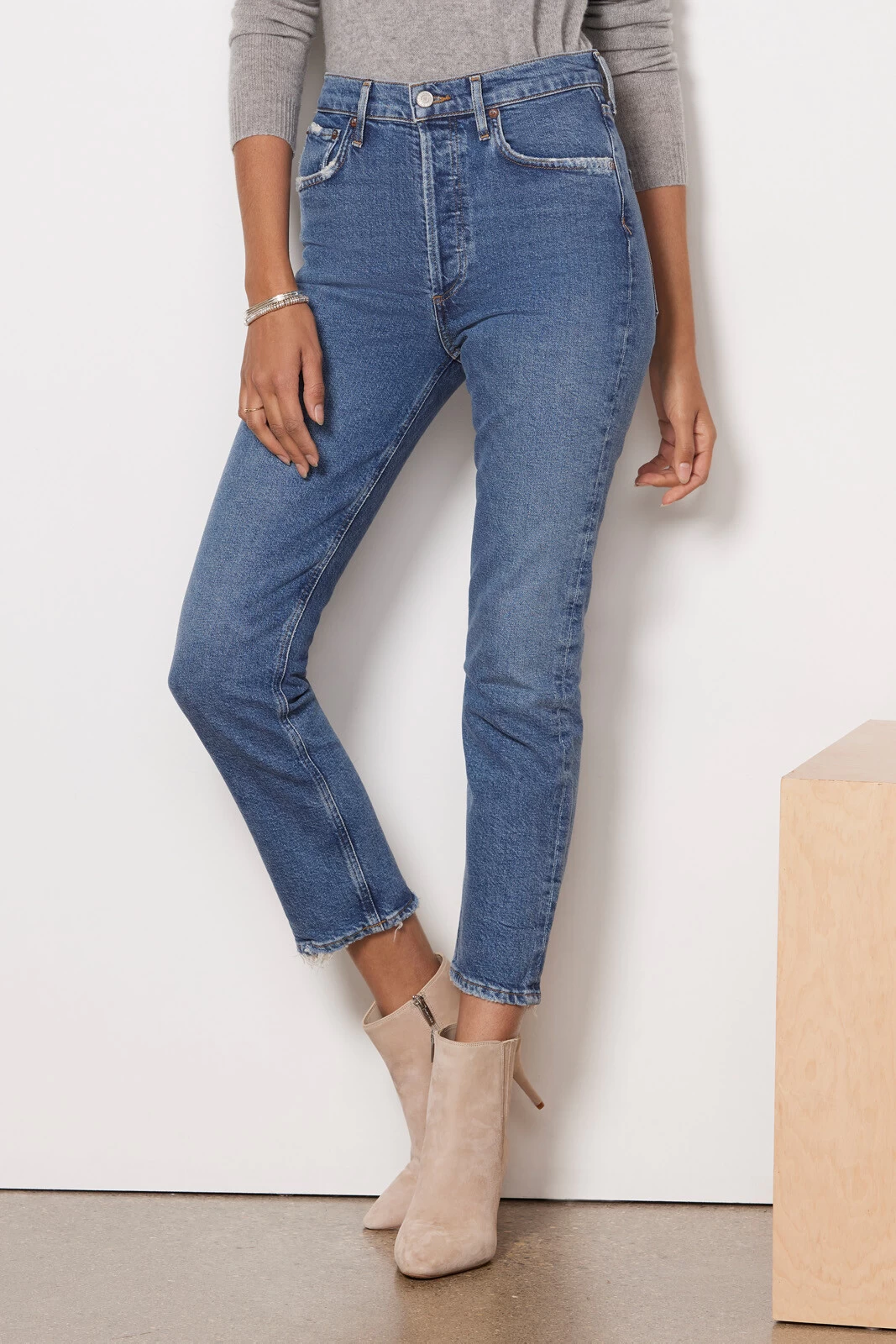 Elevate your denim collection with the Riley jean by AGoldE. Crafted in a blend of cotton and recycled Lycra, these high-rise jeans feature an ankle-length straight leg, button fly closure, and subtle distressing at the pockets and hems.
