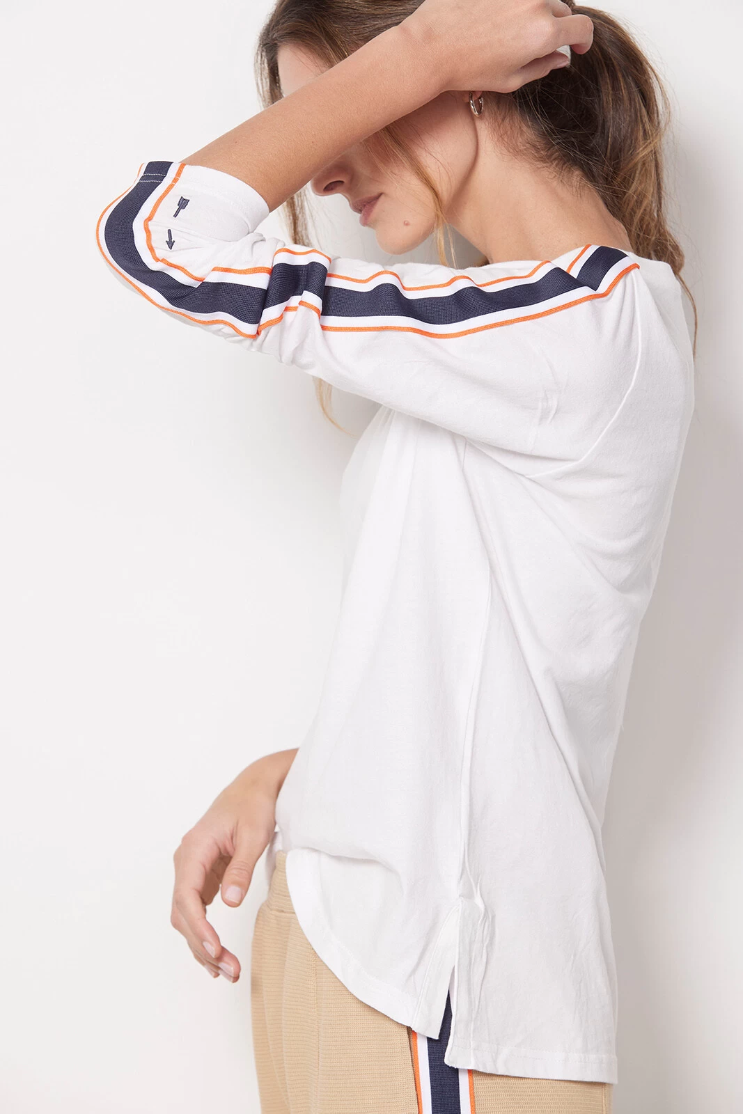 Striped sleeves give a sporty-chic feel to the Beaumont top by The Upside. Crafted in soft organic cotton, this versatile long sleeve top features a classic crew neckline and relaxed fitβperfect for pairing with everything from jeans to wide leg trousers.