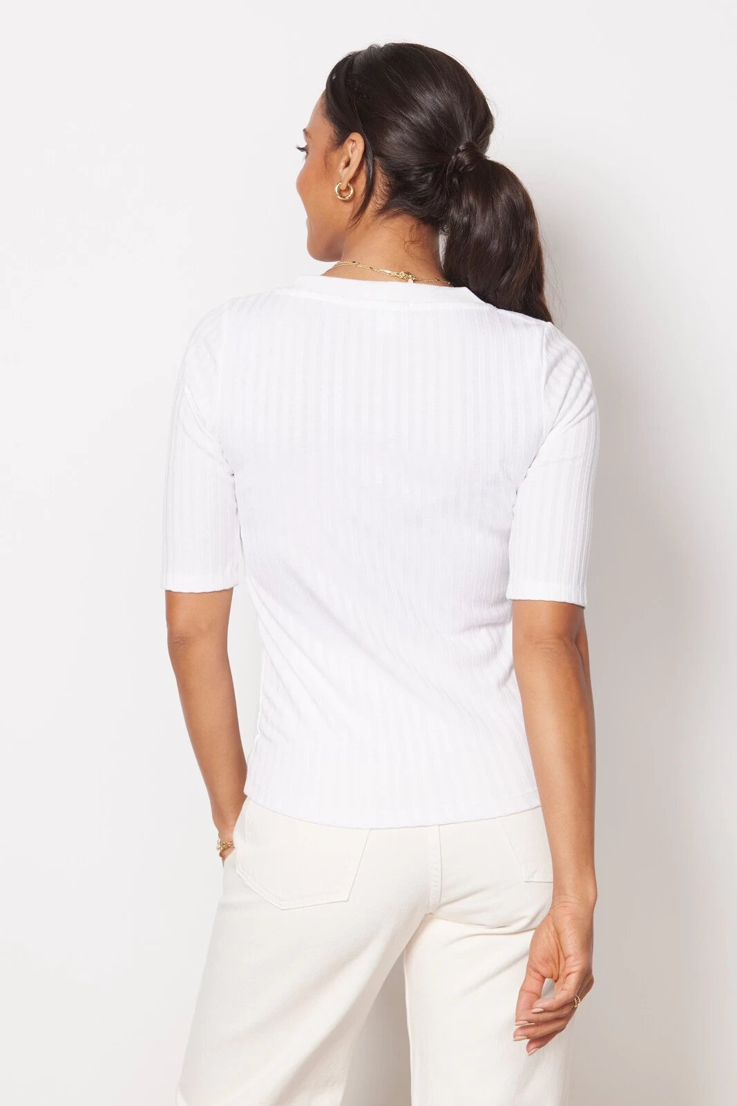 An elevated staple you’ll wear again and again. This versatile EVEREVE top is crafted in wide ribbed fabric with a flattering scoop neckline and short sleeves that hit just above the elbow. Wear it alone, or layer with your favorite jacket.