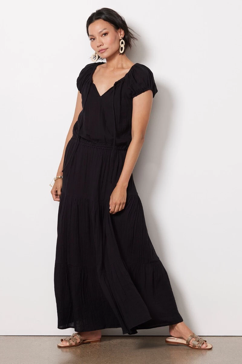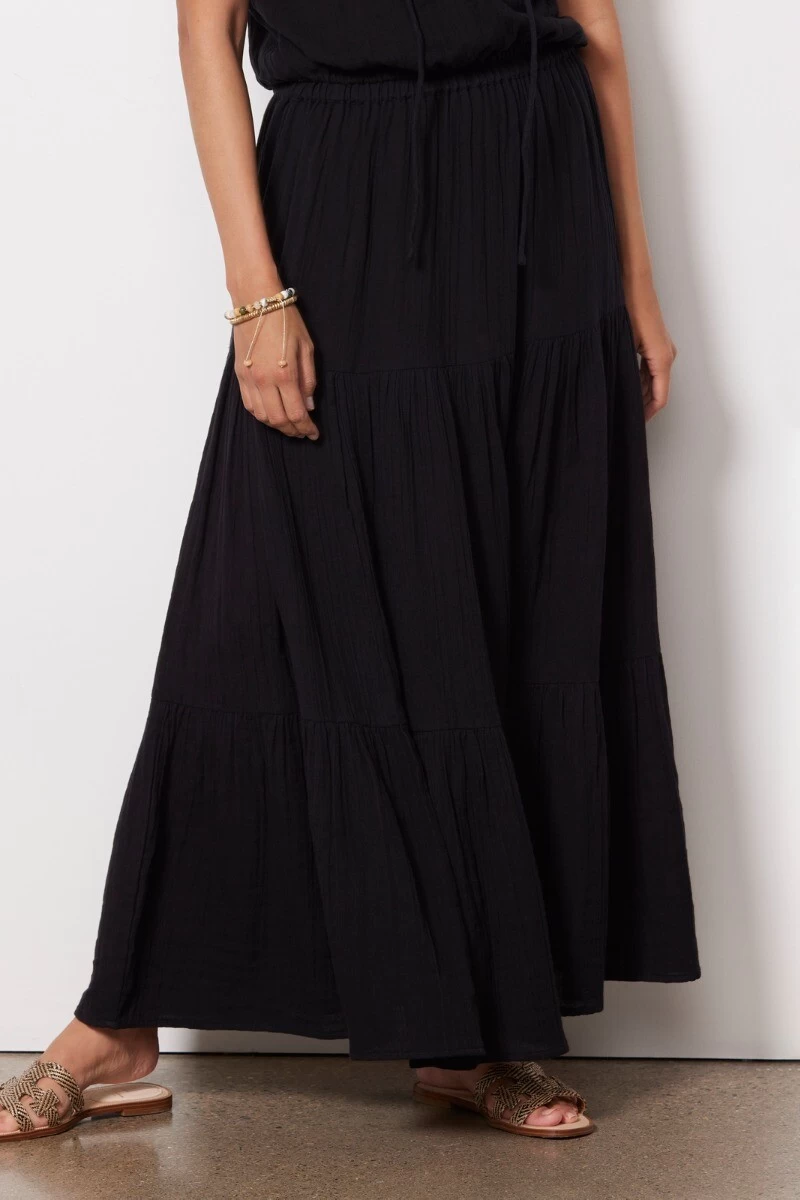 Breezy and versatile, this Sundry maxi skirt features a tiered silhouette, elastic waistband, and cotton gauze fabric. Pair with a tank and denim jacket, or wear with the matching Puff Sleeve Blouson Top for a stylish set.