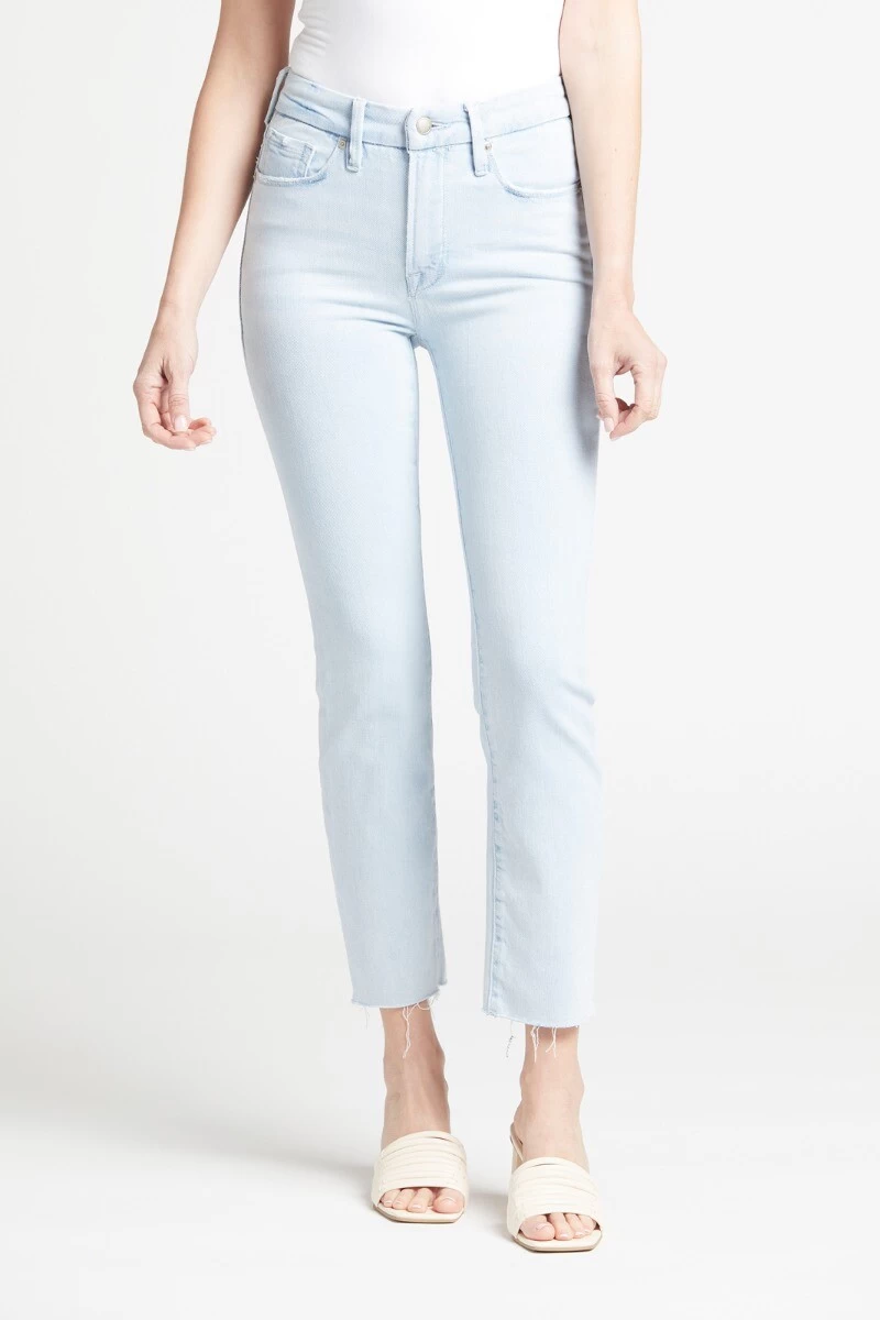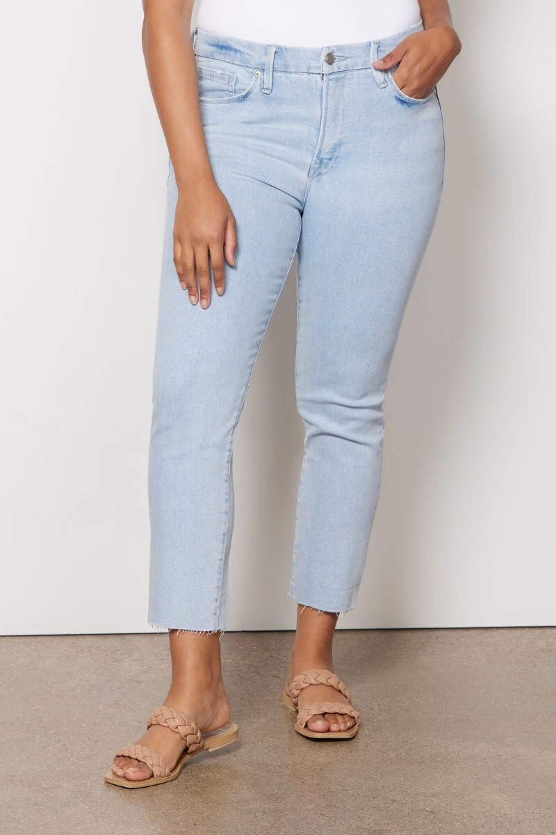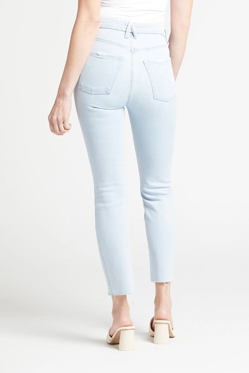 These flattering high-rise jeans feature raw, ankle-length hems and a modern cigarette leg—fitted through the hips and thighs with a straight cut from knee to ankle.