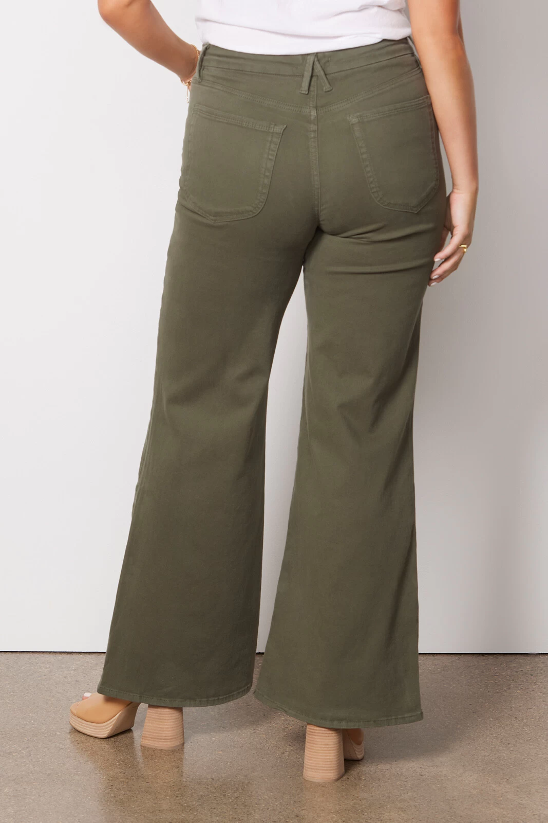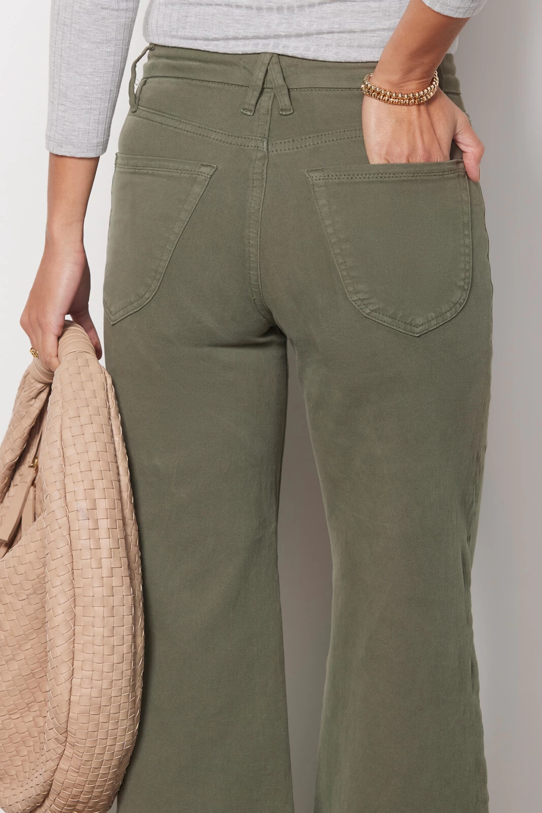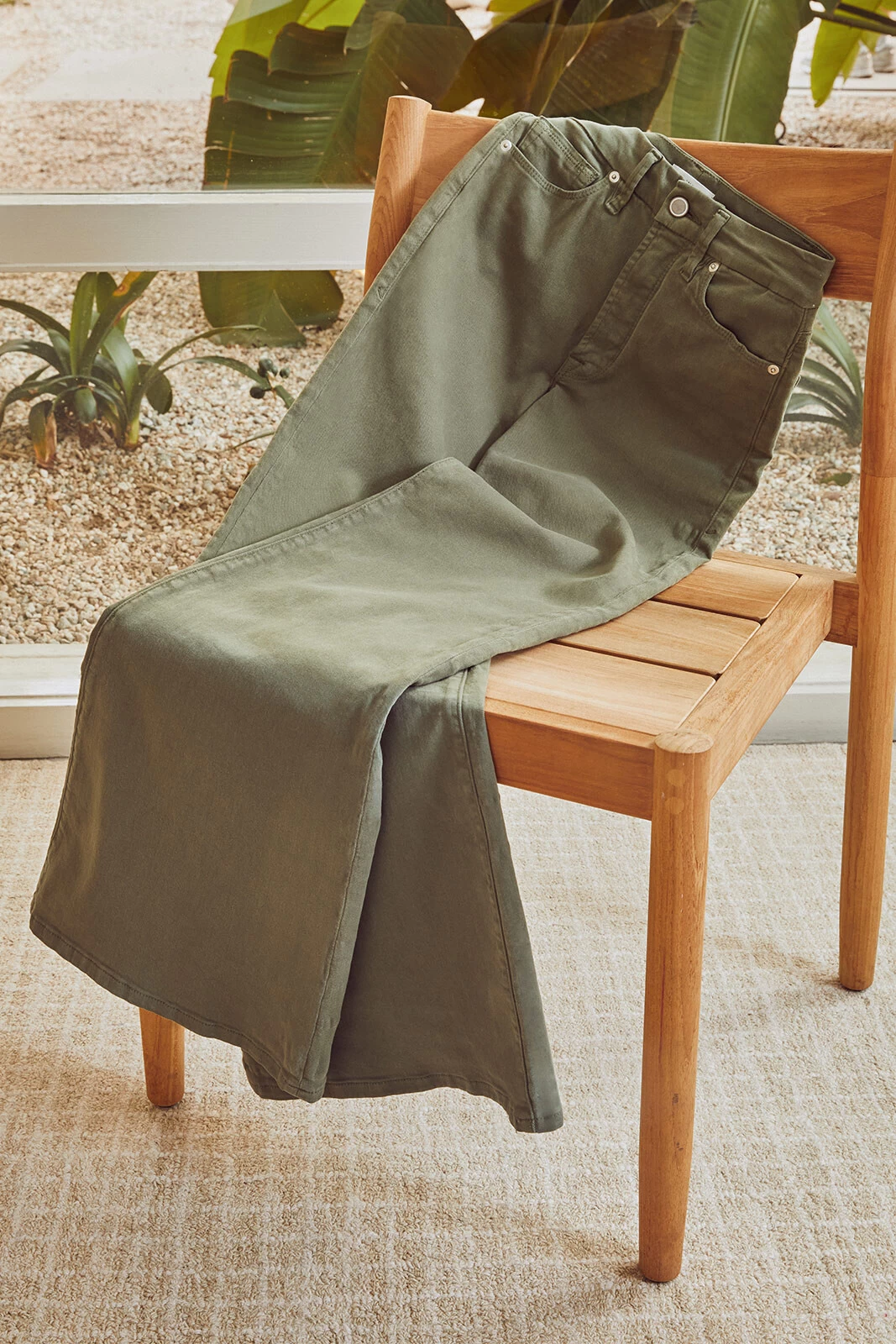 A dramatic wide leg defines these flattering trousers by Good American. The Good Waist Palazzo features a high-rise fit, olive green twill fabric, and a full-length inseam that elongates the leg—perfect for pairing with a sleek heel or platform.