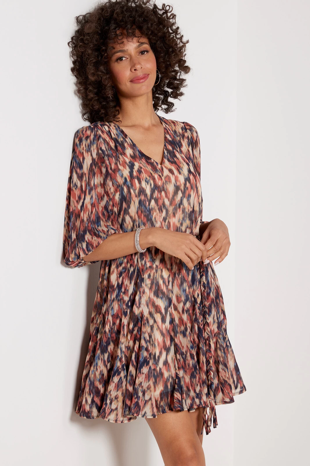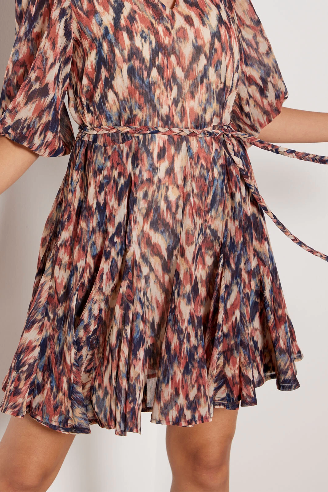 A watercolor ikat print elevates this stylish EVEREVE mini dress featuring a lined silhouette with elbow-length puff sleeves, a back keyhole detail, and a removable braided belt to define the waist. Wear on any day or night occasion with sandals and a bracelet stack.