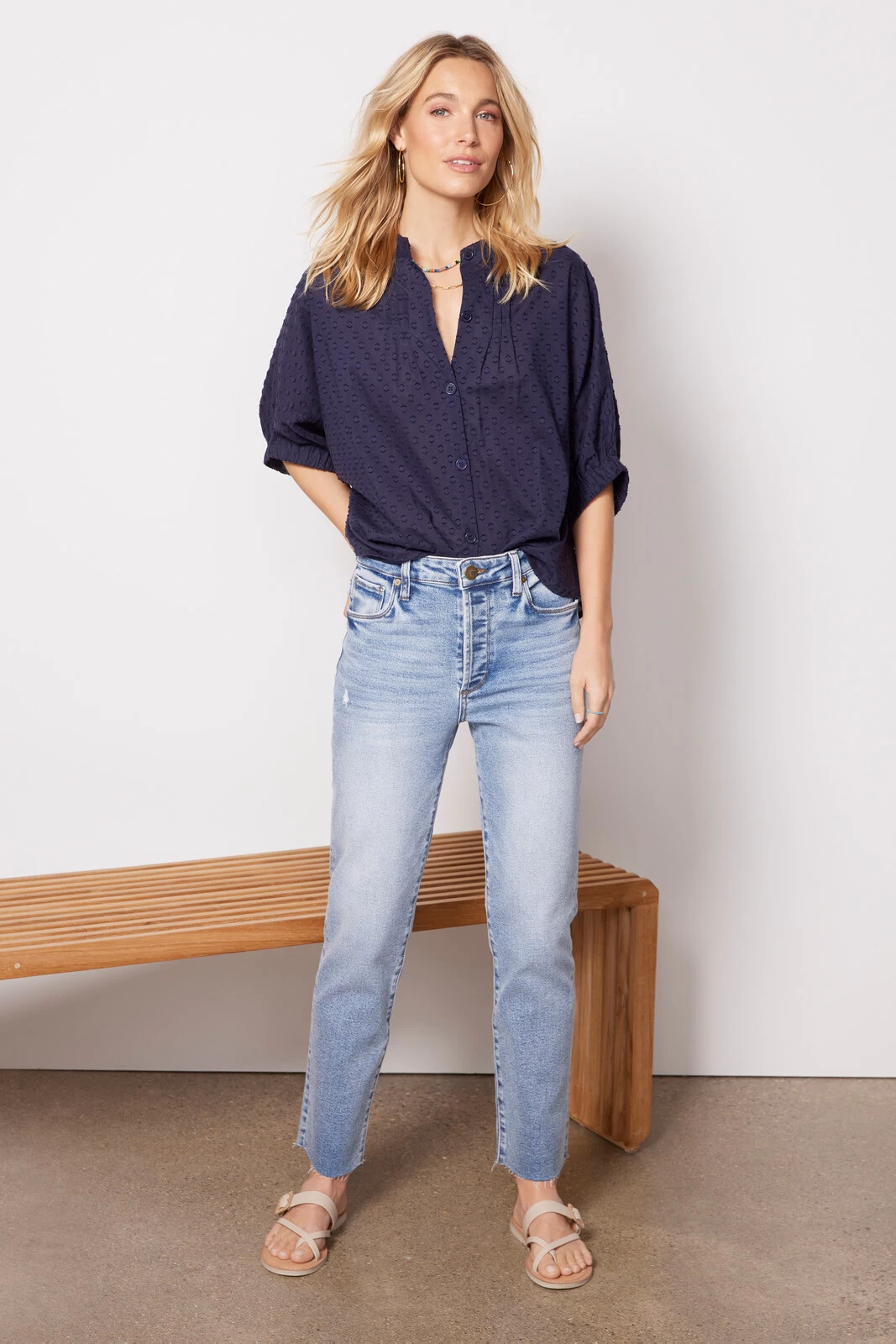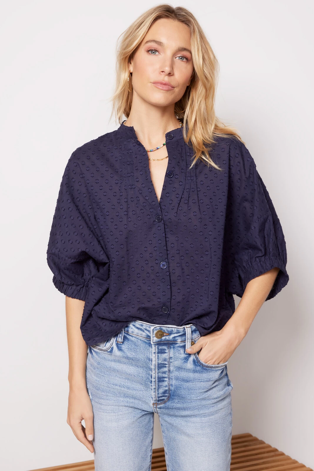 Crafted in organic cotton Swiss dot fabric, this button-front blouse by Emerson Fry features a mandarin collar, elbow-length puff sleeves, and pleated yoke detailing. This spring-ready top is finished in a flowy fit for an easy, effortless feel—perfect for tucking into jeans or utility pants.