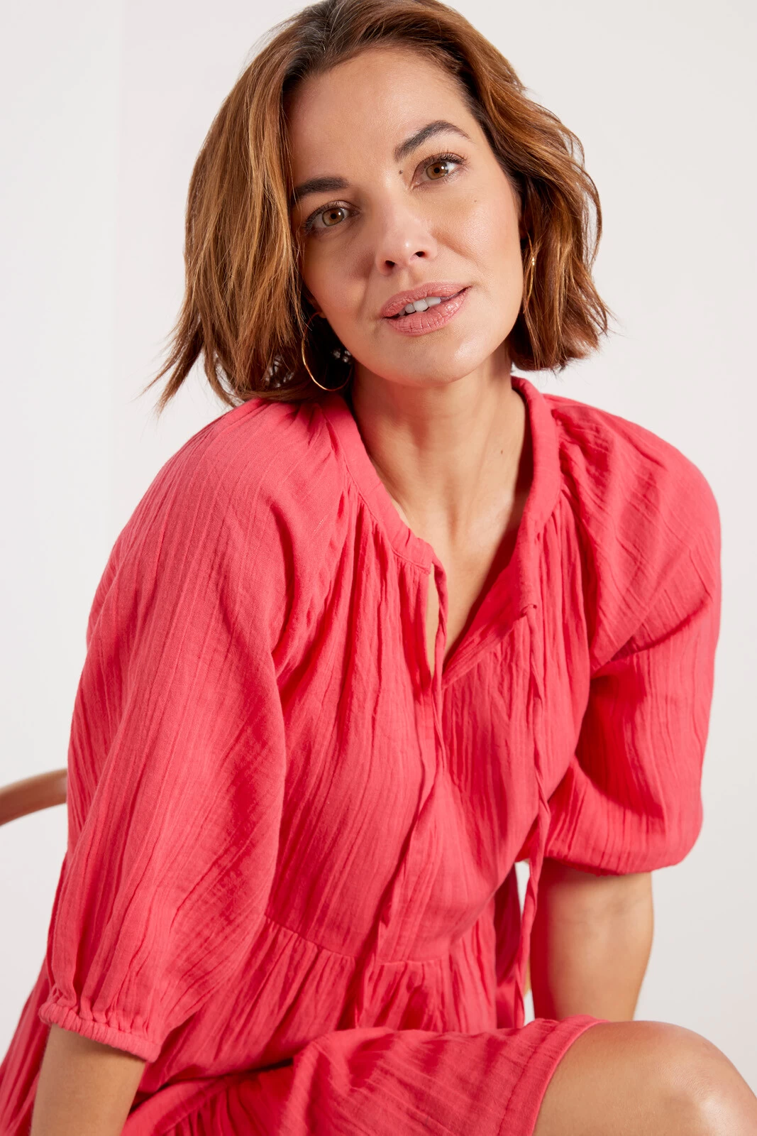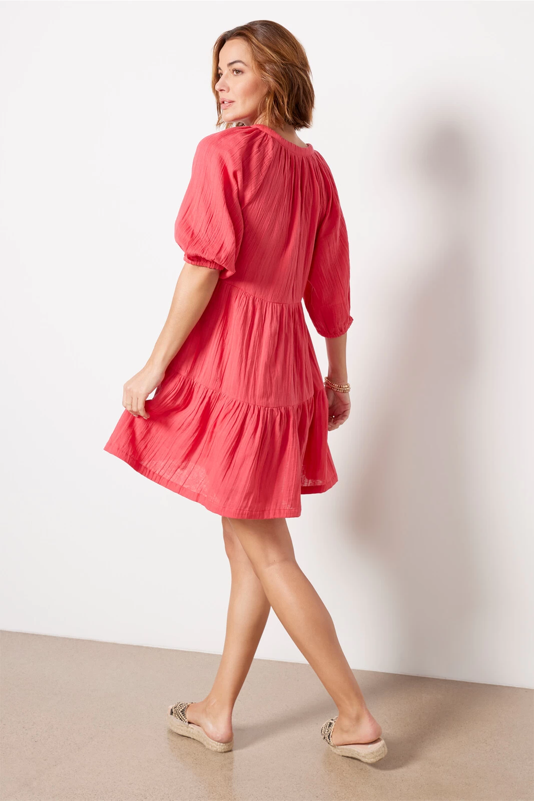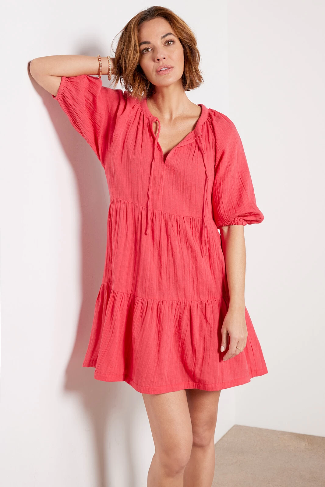 Easy, breezy, and effortlessly stylish, this tiered dress by Sundry is crafted in cotton gauze fabric with a split tie neckline, side pockets, and elbow-length sleeves. Just add sandals and a stack of bracelets for the perfect warm-weather look.