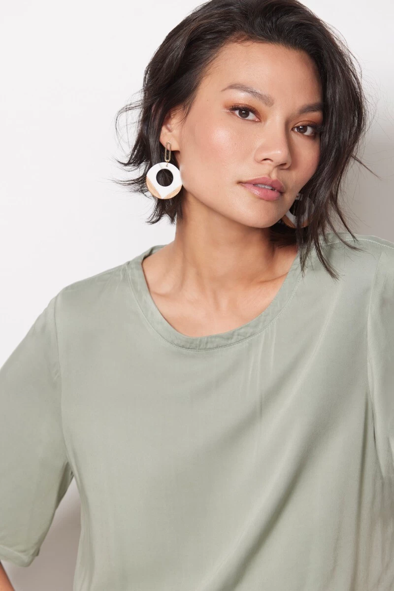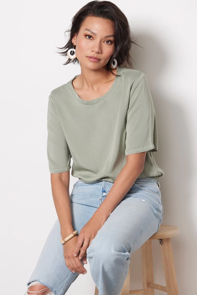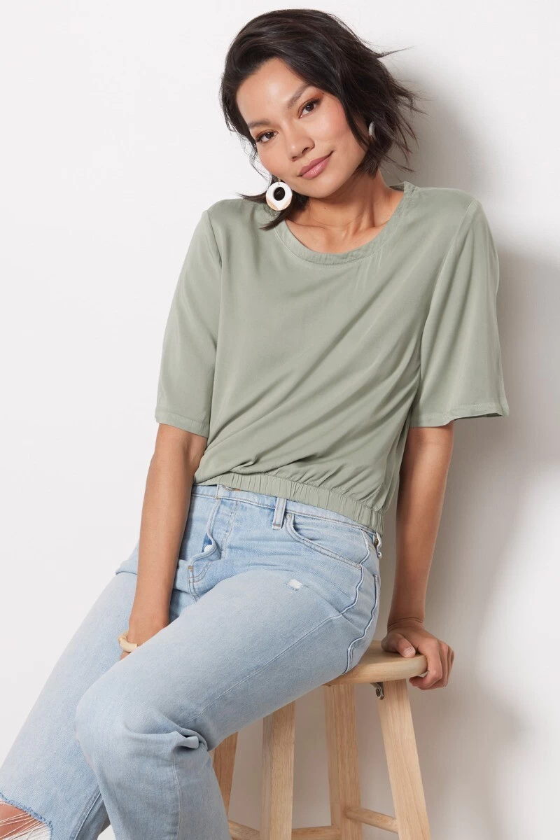A smooth EcoVero fabric adds a luxe feel to this Cloth and Stone top featuring a banded elastic hem, crew neckline, and elbow-length sleeves. Take it from work to weekend with your favorite jeans or trousers.