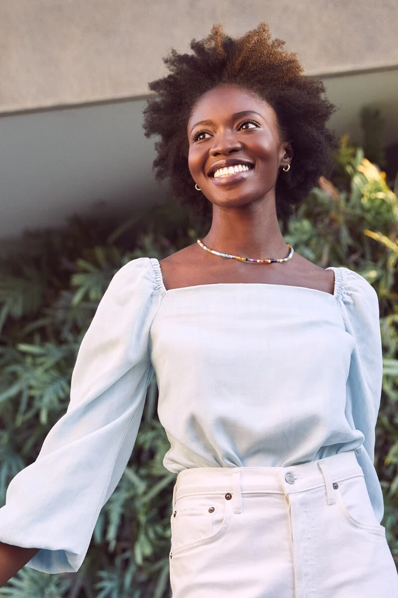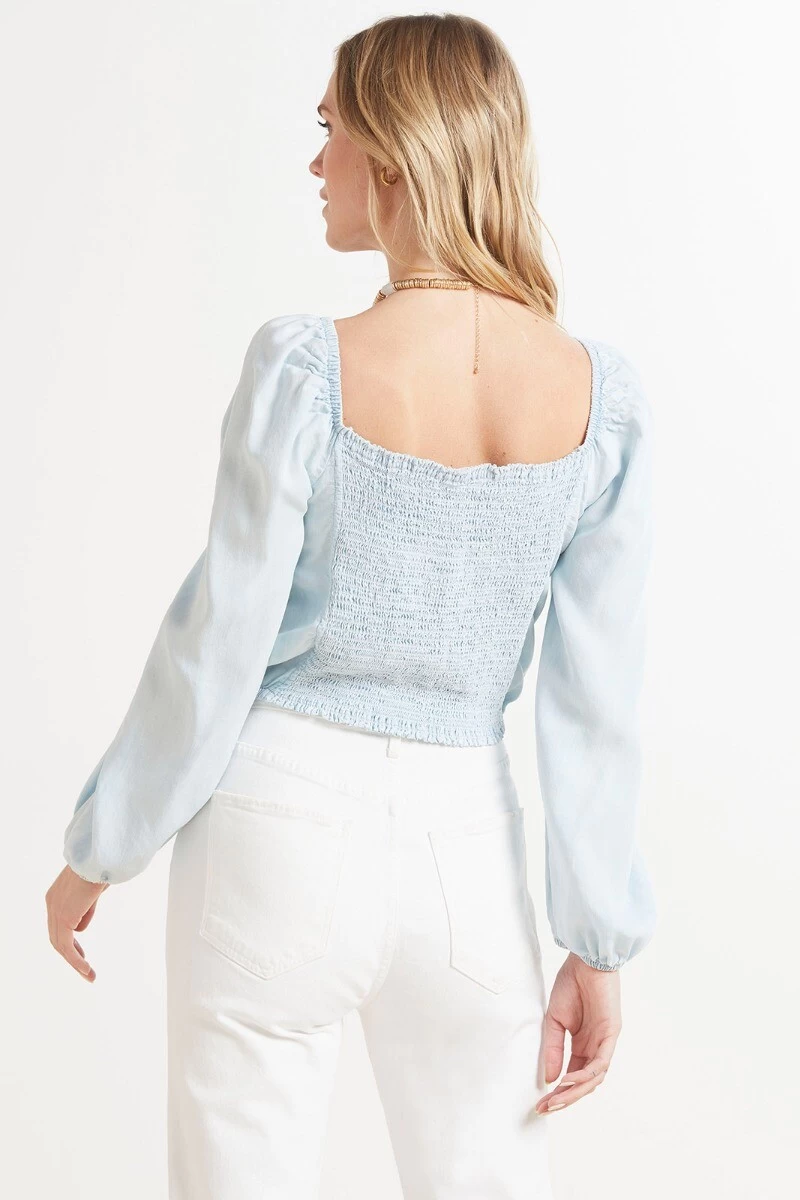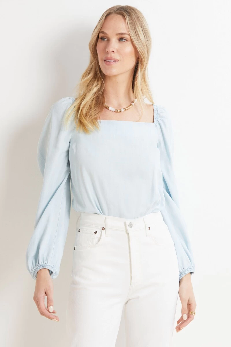 A square neckline and smocked back detail add to the effortless style of this Cloth and Stone top. Perfectly paired with jeans or shorts, this Tencel chambray shirt features chic bishop sleeves and elastic at the cuffs, shoulders, and hem.