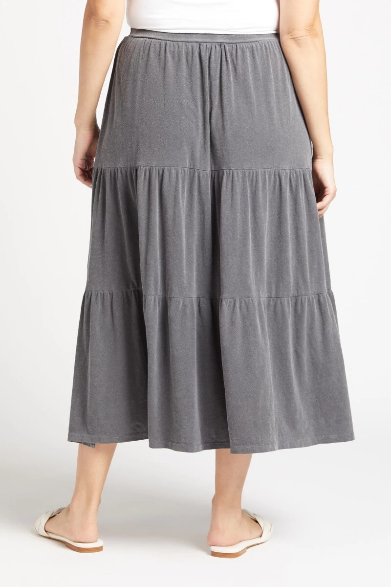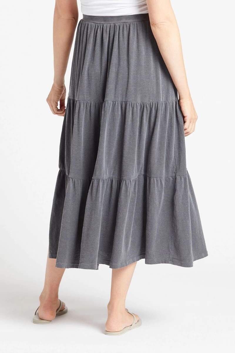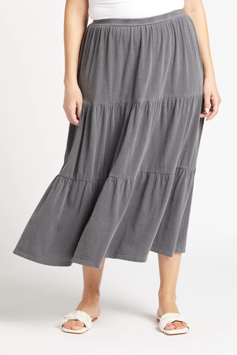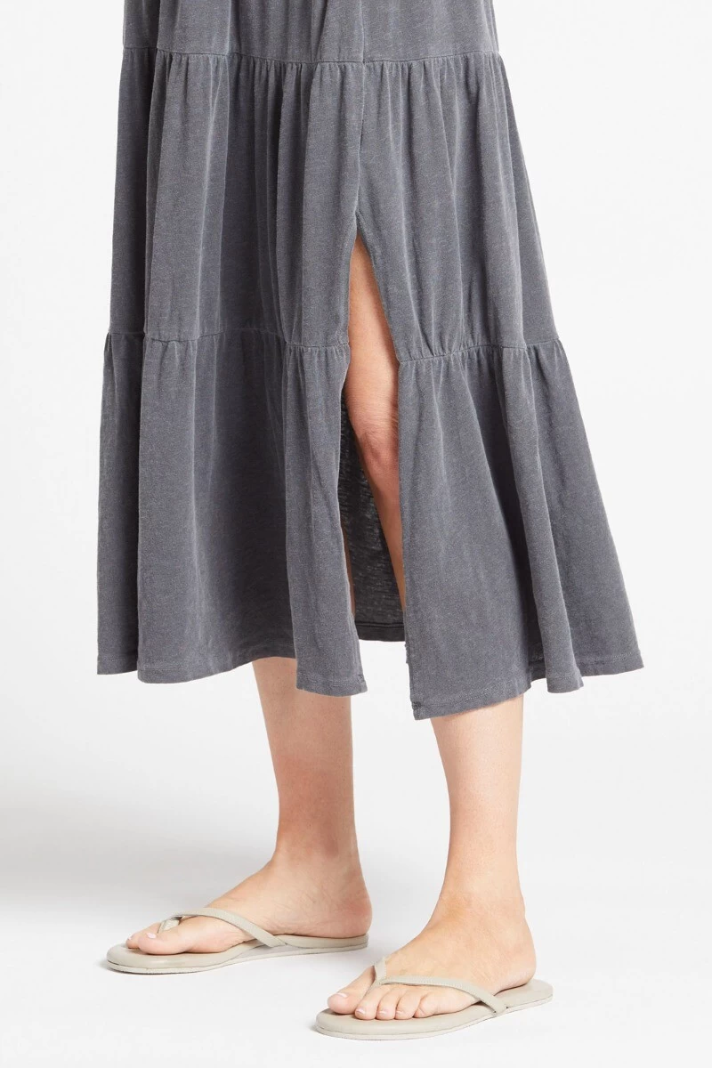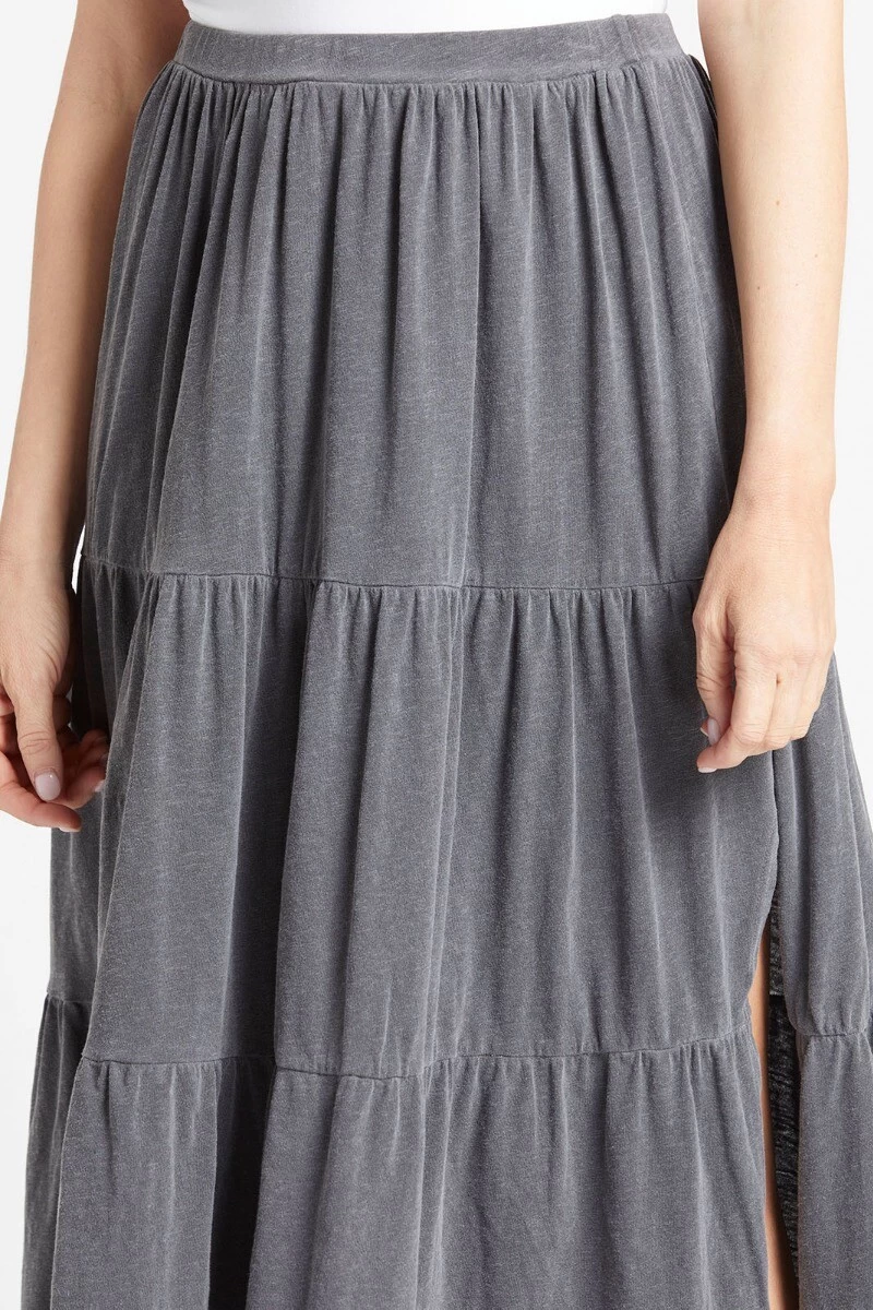 Finished in a soft jersey fabric, this flowy Sundry skirt features a tiered midi silhouette with a breezy side slit and elastic waistband. Pair with a tank and denim jacket, or complete the matching set with the Gathered Neck Top.