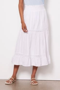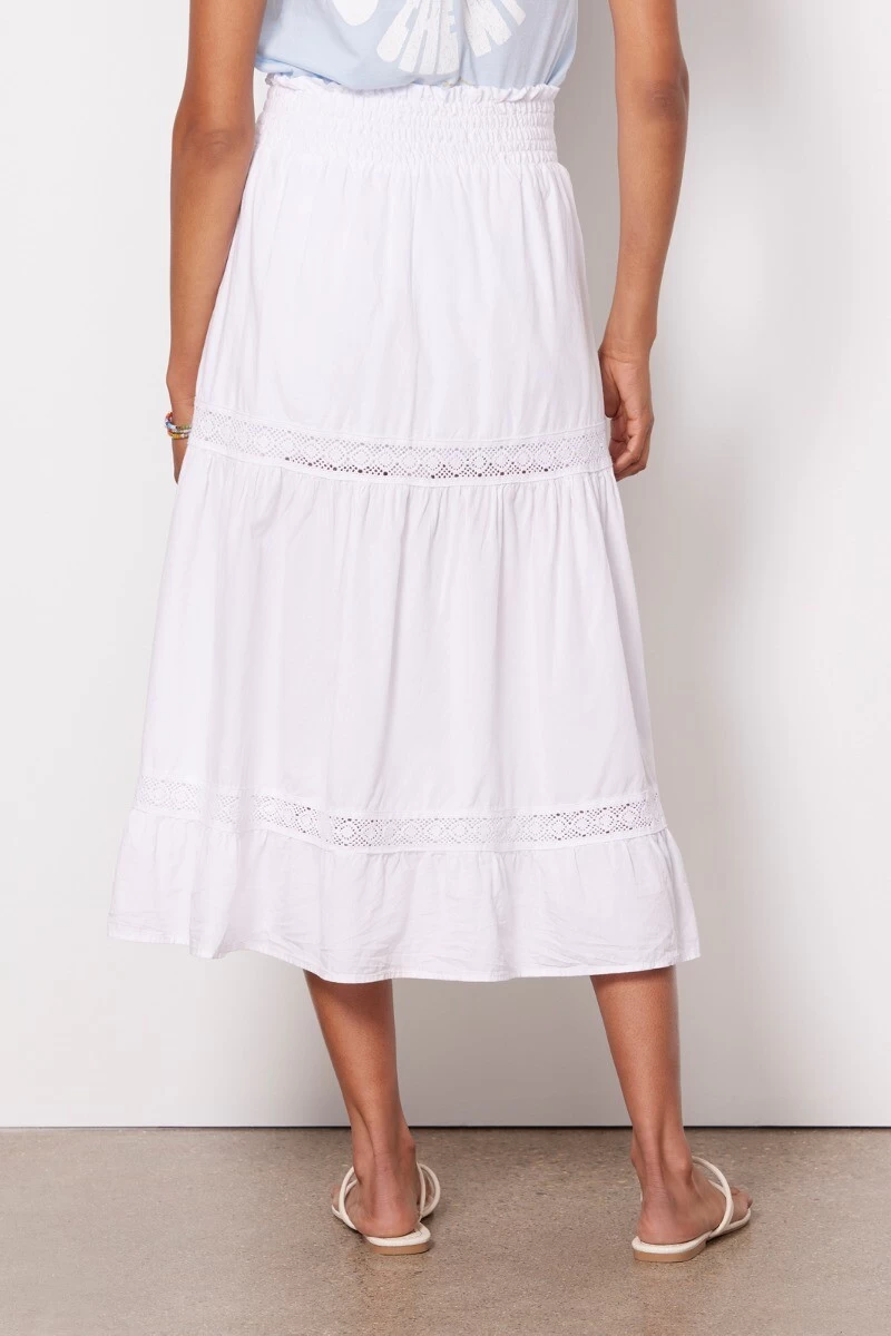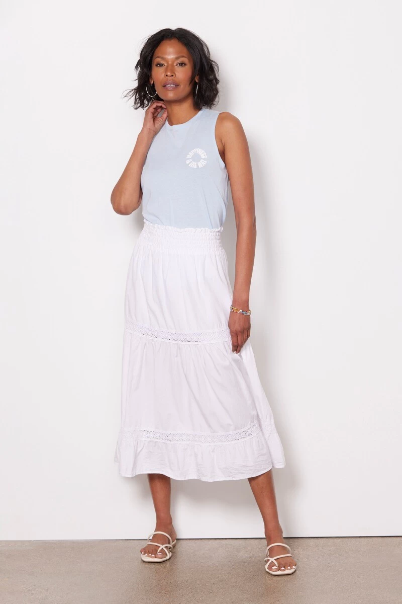 Lace insets elevate this versatile tiered skirt by Red Haute featuring a partially lined silhouette, smocked elastic waistband, and woven poplin fabric. Dress it up with a blouse and heels, or pair with a tee and sandals for a casual-chic look.