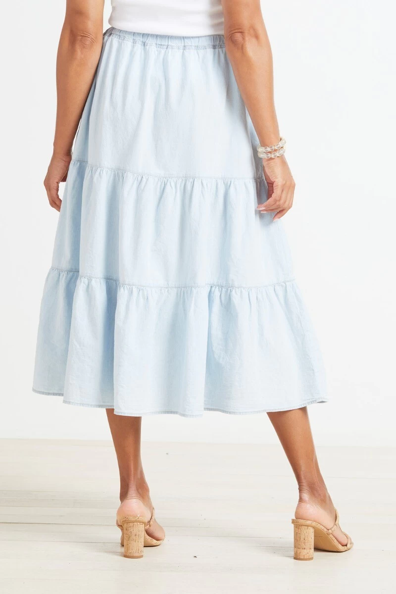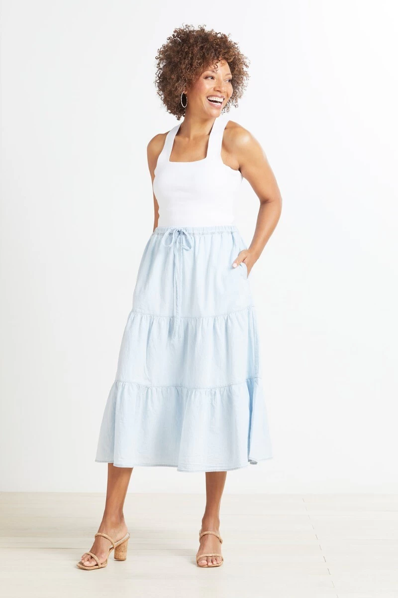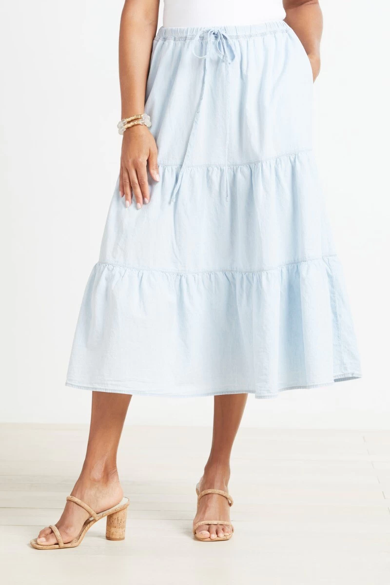 Chambray fabric adds a spring feel to this stylish tiered skirt by Velvet featuring side seam pockets and a drawstring waist. Pair with a classic tee and slides for a laid-back look.