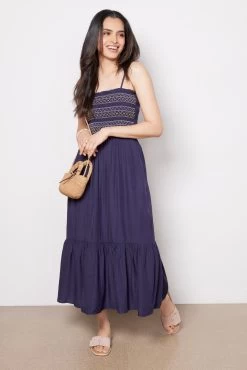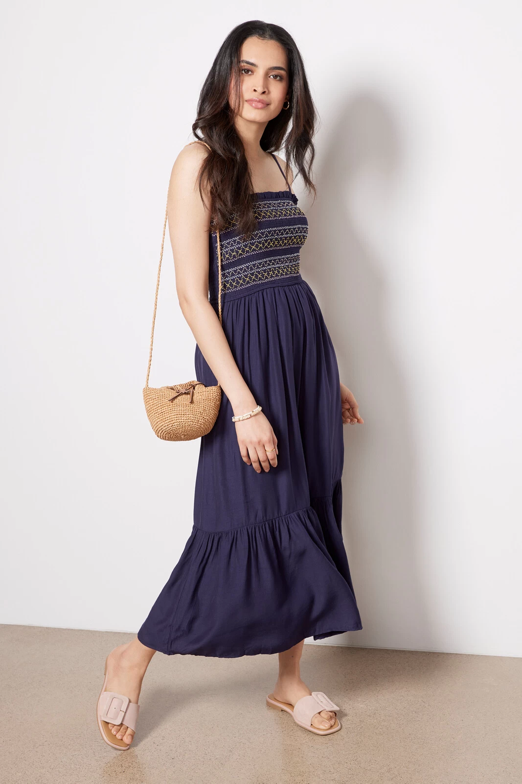 A smocked bodice with embroidered detailing defines this summer-ready midi dress by EVEREVE featuring adjustable spaghetti straps, side pockets, and a flowy tiered hem. Add a denim jacket and slides for the perfect warm-weather look.
