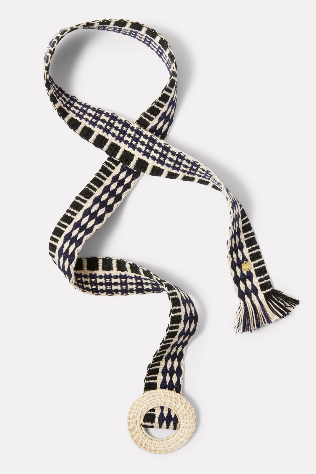 Add a touch of texture to your look with this woven Guanabana belt. This boho-chic belt features a geometric pattern, fringe edge, and pull-through raffia buckle. Pair with utility pants or cutoffs, or wear at the waist with a flowy maxi dress.